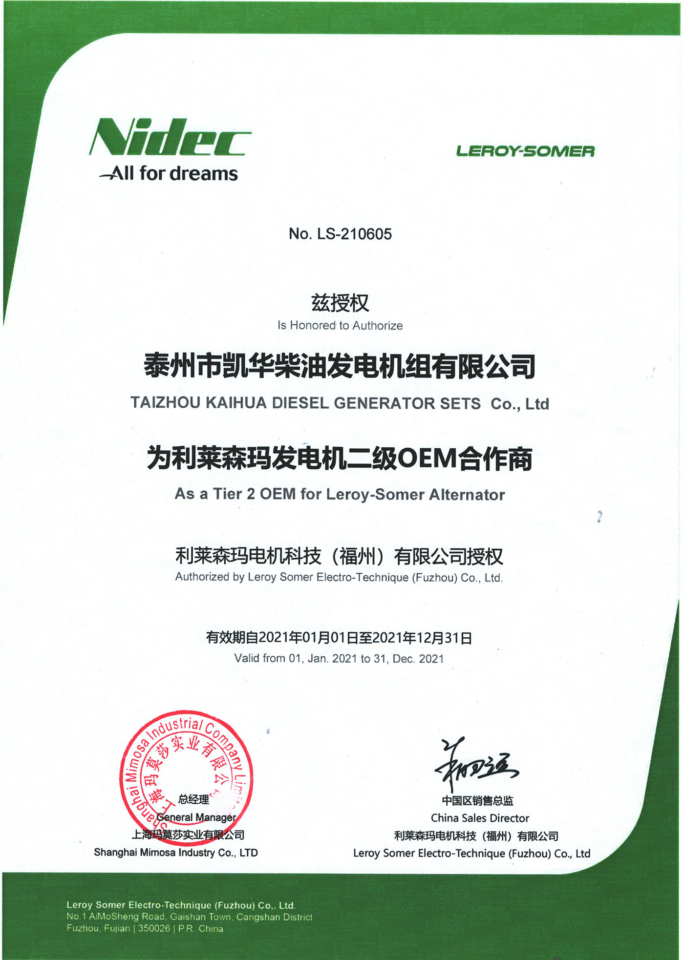 泰州市凱華柴油發(fā)電機組有限公司創(chuàng)建于2003年,是一家集柴油發(fā)電機組燃氣發(fā)電機組的研發(fā)、生產(chǎn)、銷售為一體的高新技術民營企業(yè),公司座落于“漢唐古郡,淮海名區(qū)”,具有“鳳凰城”美稱的祥泰之州——江蘇省泰州市,地處中國經(jīng)濟最發(fā)達的長三角經(jīng)濟圈,水陸空立體交通,地理位置十分優(yōu)越。公司目前注冊資本金11800萬元人民幣,生產(chǎn)基地占地六十畝,現(xiàn)有各類高素質(zhì)員工一百多名,專業(yè)技術人員達46人,其中高級技術人員16人,年銷售額近6億元。 公司主營產(chǎn)品:3~3000KW陸用柴油發(fā)電機組,15~600KW移動拖車電站,12~1000KW船用應急柴油發(fā)電機組,各種靜音型、中高壓、多機并聯(lián)、燃氣等特種機組以及進口系列柴油發(fā)電機組,可滿足不同客戶的一切電力需求,還可滿足用戶不同電壓、不同頻率的要求。凱華公司是康明斯品牌的授權代理商,專業(yè)生產(chǎn)供應康明斯柴油發(fā)電機組。